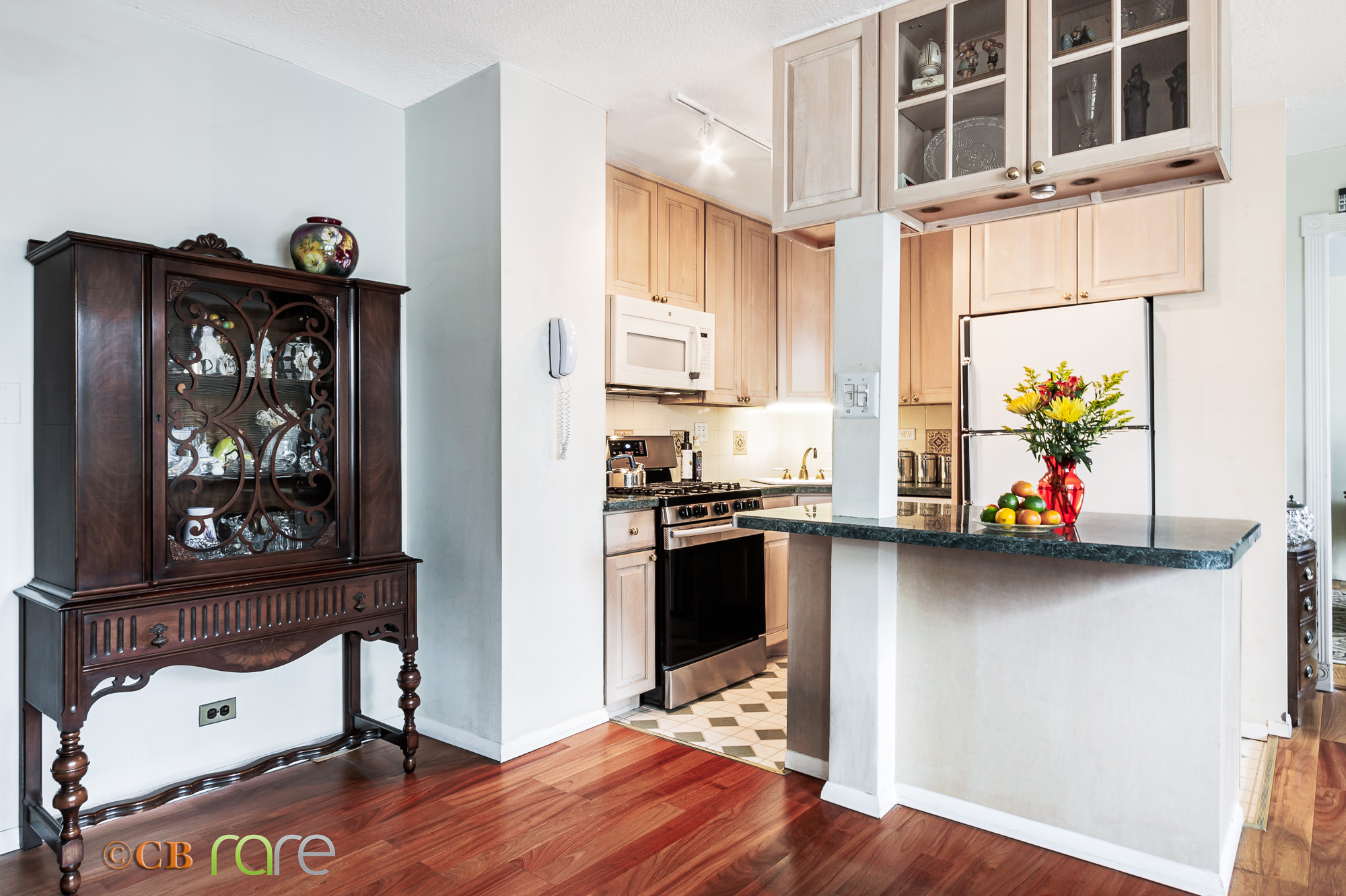 This renovation (of the already combined units) features a large entry foyer that opens into the kitchen designed for super storage and counter space, and two dining areas – formal and casual.